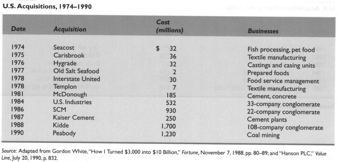 The Imperial Group acquisition was the textbook case. Hanson paid ÂŁ2.5 billion but recouped nearly the entire amount by selling off Courage Brewery, the off-license chains, Golden Wonder crisps, hotels, restaurants, and food businesses. It retained only the profitable tobacco operations (Embassy, Lambert & Butler, John Player Special). The same pattern repeated across dozens of deals: buy cheap, strip away distractions, sharpen the core businesses, and generate strong cash returns for shareholders. Legacy By the mid-1990s Hanson PLC ranked among the largest companies in the United Kingdom and had a significant presence on the New York Stock Exchange. In 1996 the group demerged into four separate listed companies: Imperial Tobacco, The Energy Group, Millennium Chemicals, and a continuing Hanson PLC focused on building materials.